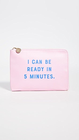 Famous last words. Even if your interpretation of this statement means that you’ll be ready in 7 minutes or even 20 minutes, we won’t judge. If the recipient isn’t keen on revealing their stance on punctuality to the world, they can simply flip this inside out to reveal a cool, graphic print that will do double duty as makeup case and evening clutch.