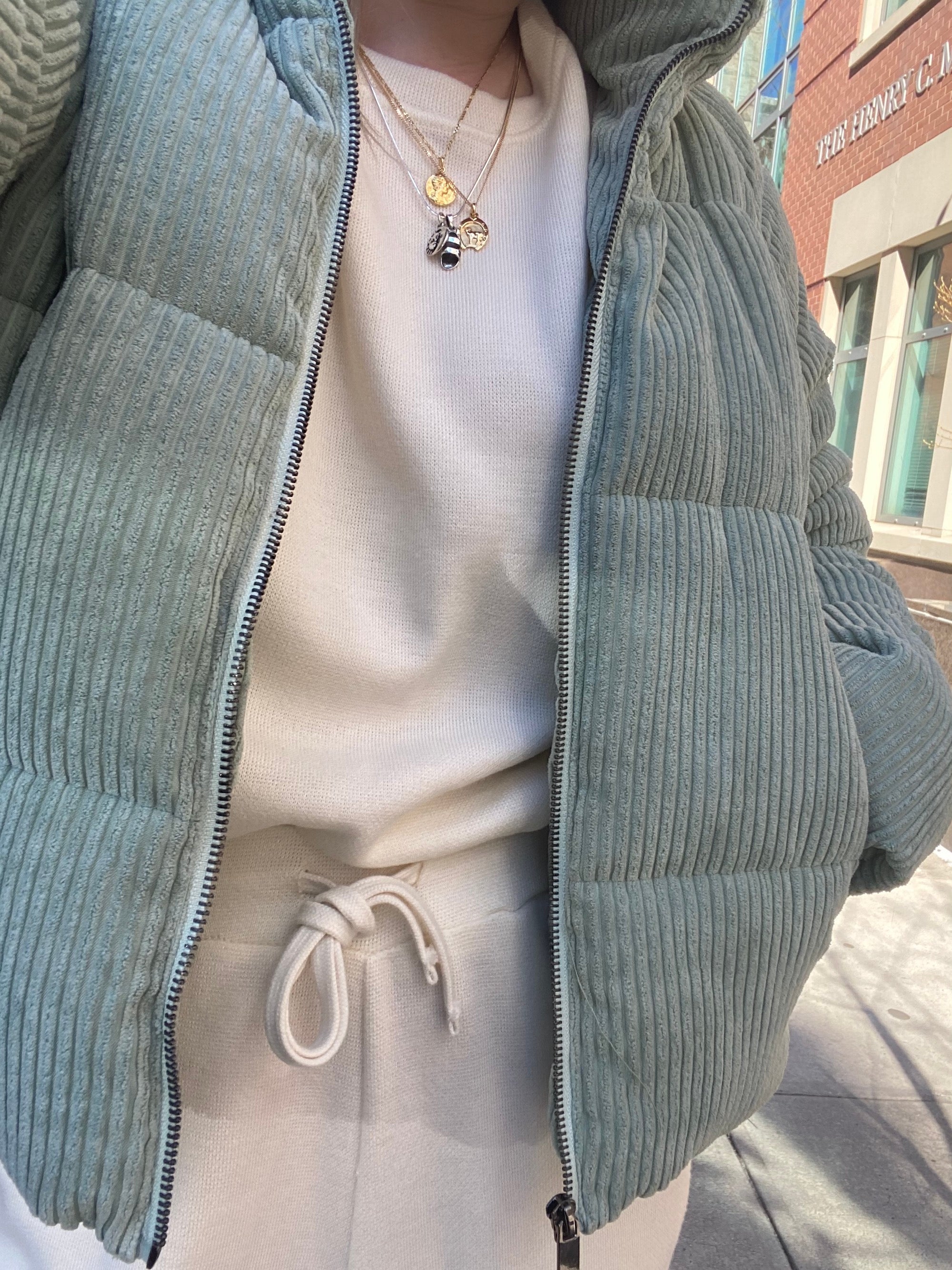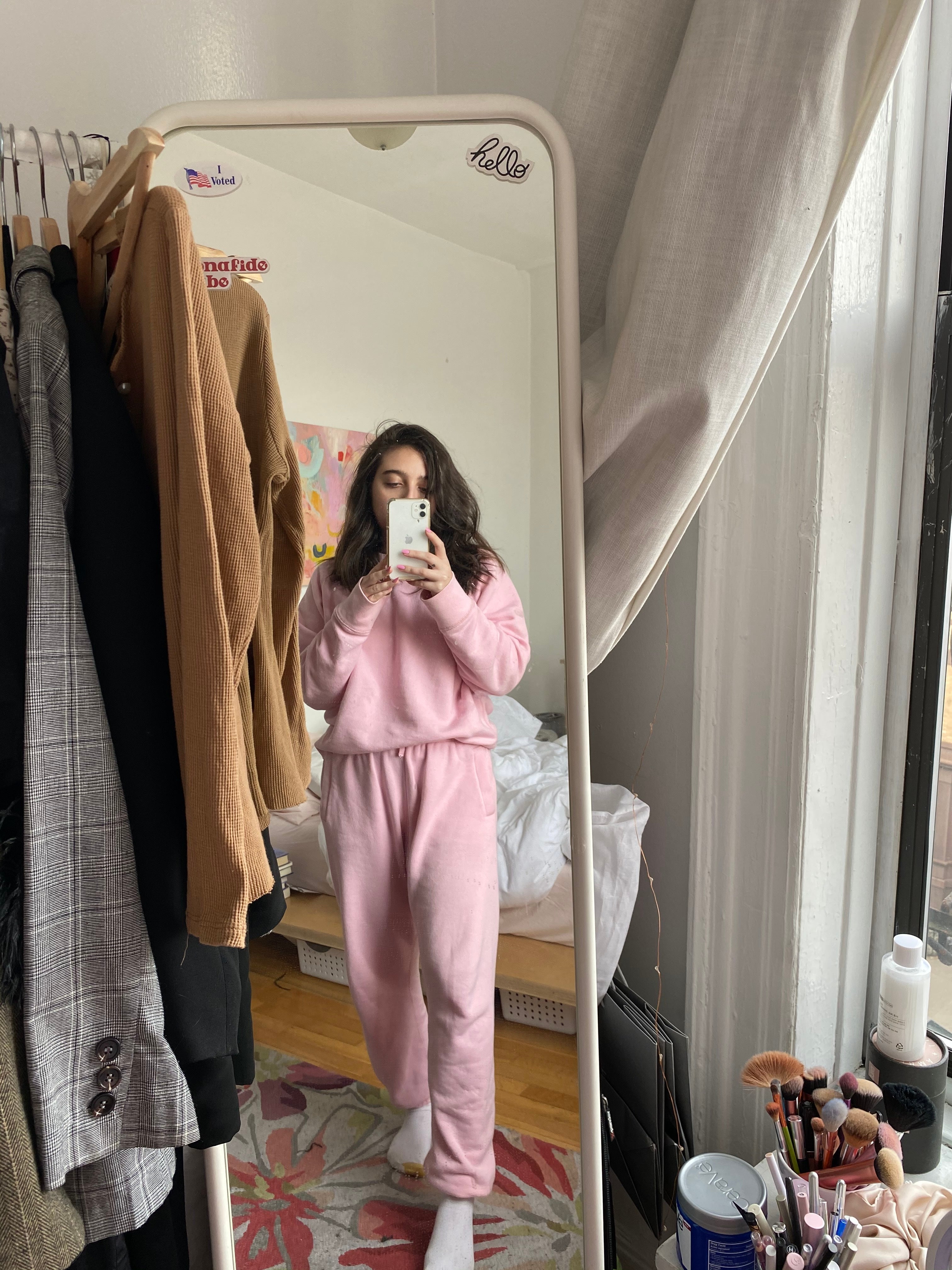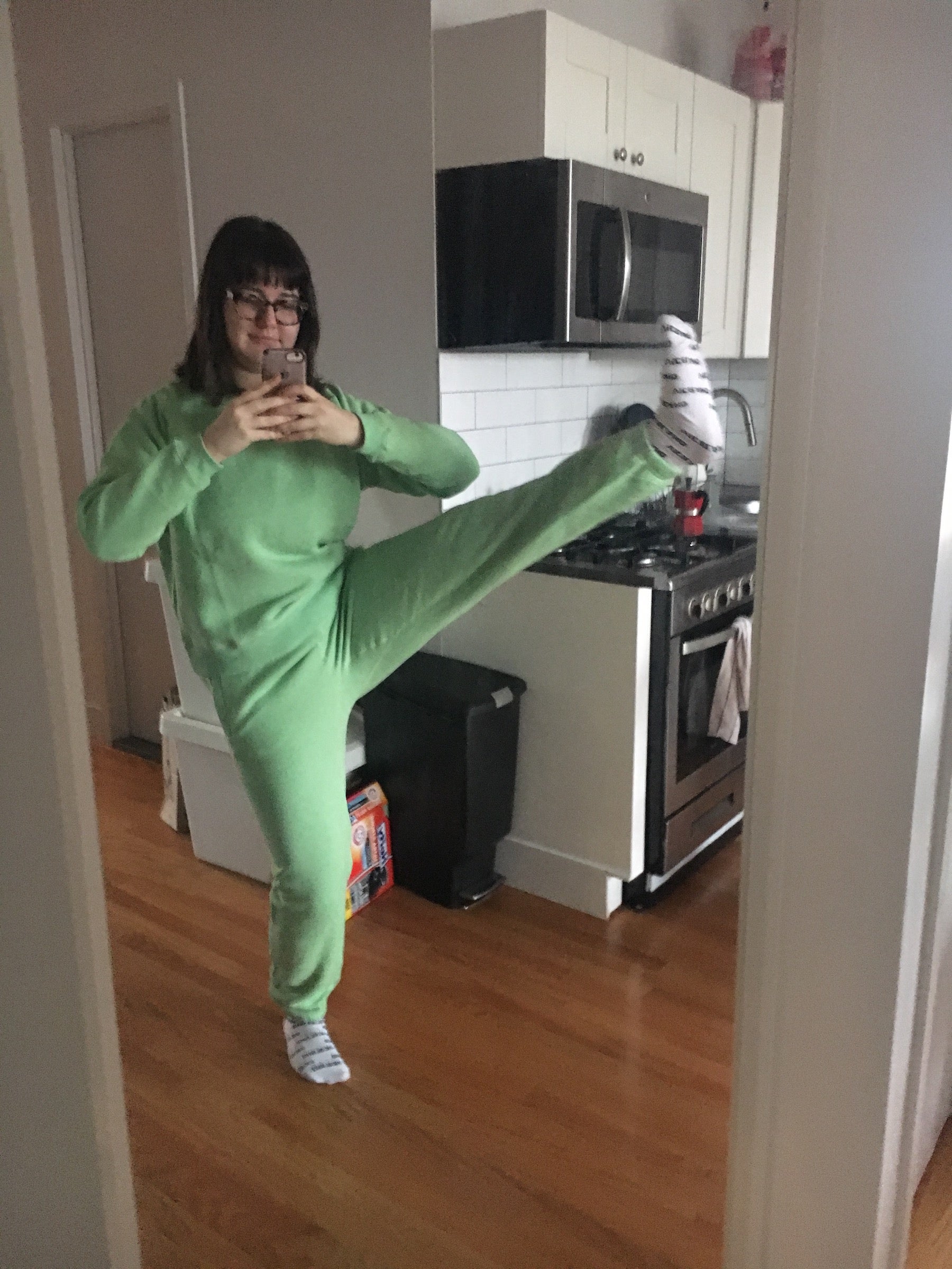 For me it's all about the sweatsuits — a matching set that makes me feel cute but cozy. I have two in rotation right now: a green one from Entireworld, and a slime-colored one from Lou & Grey.