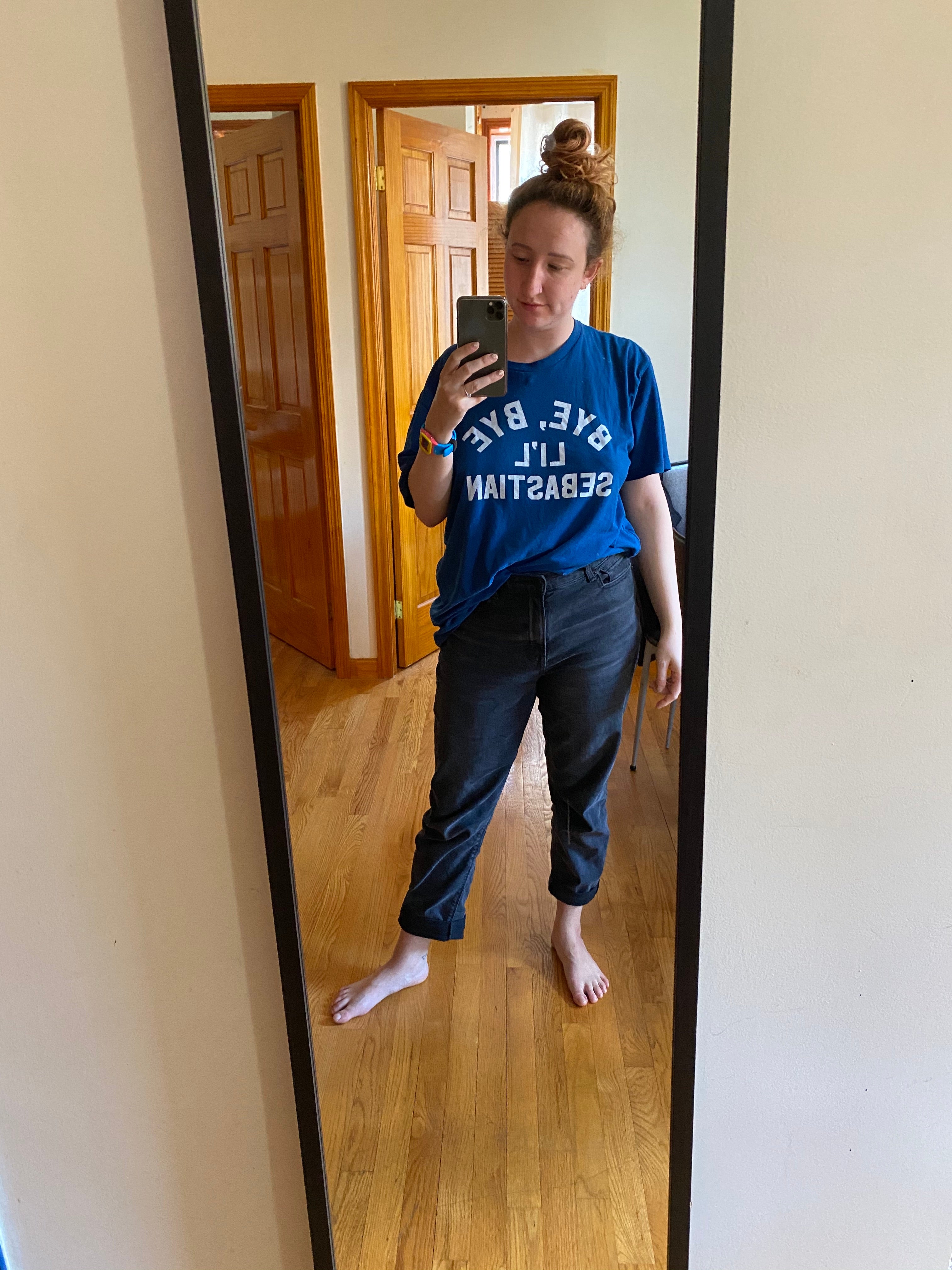 T-shirts and jeans. I wore sweatpants the first day but it made me too tired so I've been making myself put jeans on (but not necessarily a bra lol).