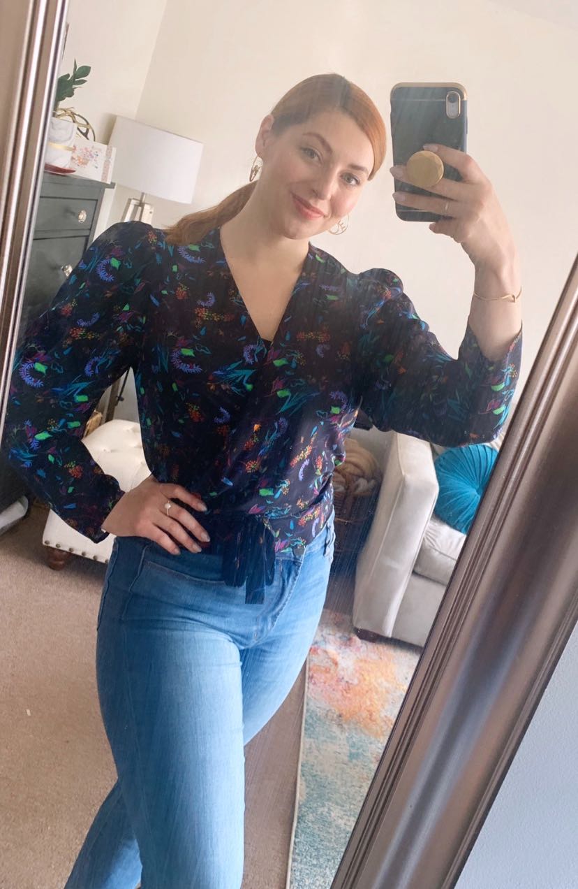 Getting dressed up and feeling good about what I wear is a form of self-care for me and is helping me stick to a normal routine. I'm wearing outfits that I would wear in the office, but also prioritizing comfort. Bold tops, jeans or comfy bottoms, and always cool earrings to bring some fun to my video calls.