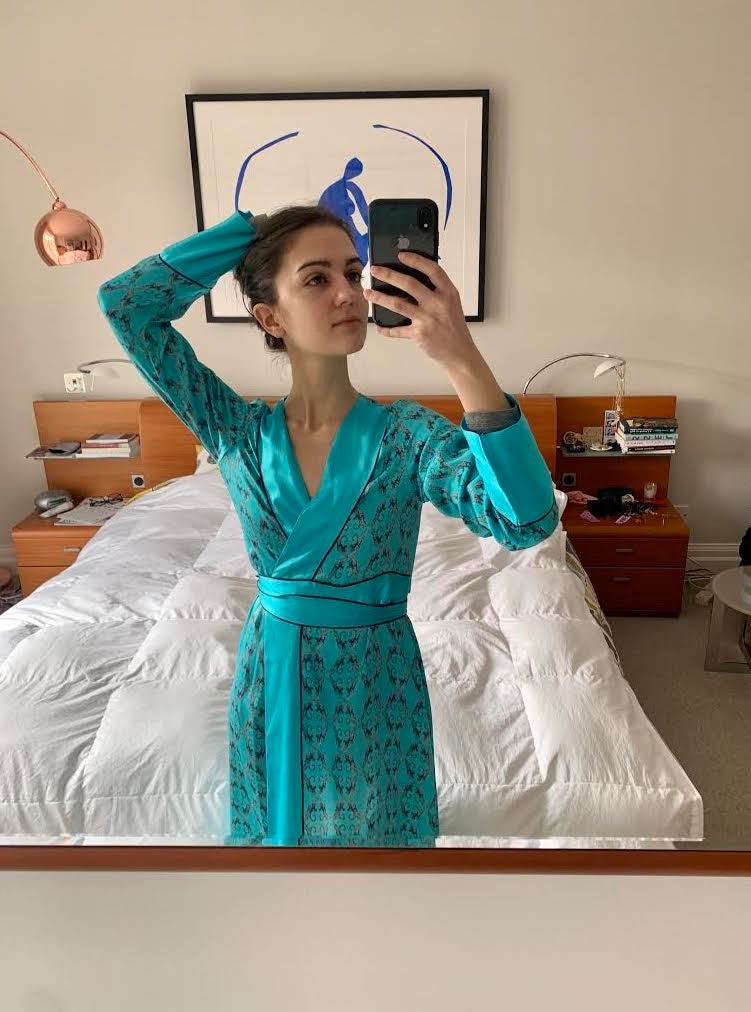 I've mostly been wearing leggings, very oversized sweatshirts à la Hailey Bieber, and an old college shirt I got when visiting my brother at Boston University ages ago (I like the memory associated with it). But today, I went full-on Zsa Zsa Gabor with a glamorous, floor-length robe by Deeba London. Do I normally wear luxury silk loungewear to hang around the house? Absolutely not. But I got this special little number for my mini-moon which I will no longer be going on, so I thought to myself... WHY NOT?