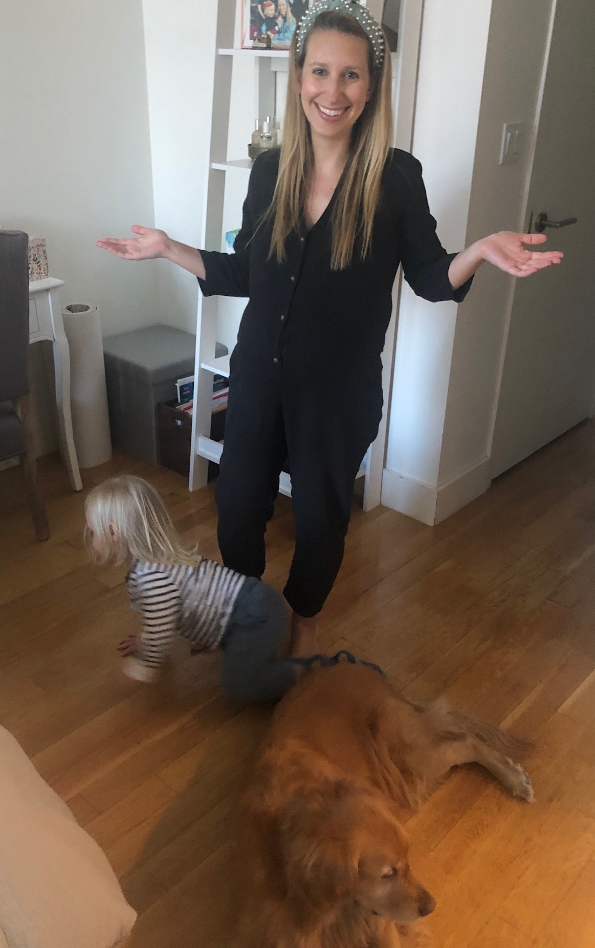 I am 31 weeks pregnant and plan to keep my Rent the Runway membership so I have been wearing a lot of "fancy" sweatshirts from RTR and one-piece maternity jumpsuits. I also put on a fun headband before every conference call as it makes me feel better about how I look on video haha.