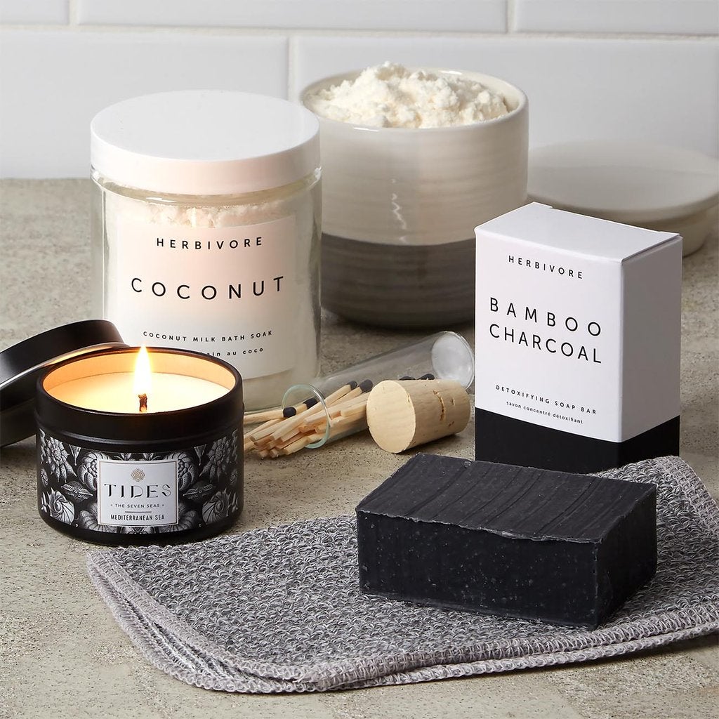 Everything you need to reset your skin and body comes in this box, including bath salts, a cleansing bar, and an exfoliating towel.