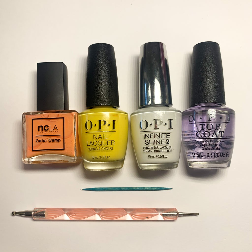 You can create your daisy print using any color scheme you like, but Lomeli recommends having four polishes on hand: a white and a yellow for the traditional daisy tones, a third shade like orange as a base, and a clear top coat to finish. For tools, you’ll need a toothpick, a rounded metal dotter, and a piece of aluminum foil as a mixing palette.